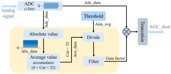 First, a fully digital AGC system was designed to reduce the impact of optical intensity scintillation on demodulation sensitivity, which is caused by underwater turbulence, bubbles, and suspended particles. The technique employs a closed-loop feedback mechanism, whose core function is to dynamically adjust the system gain by calculating the average energy of the sampled signal through a sliding average filter and comparing it to a predefined threshold. This process ensures that the output signal amplitude remains within the desired range. The system’s principle is illustrated in Figure 5. First, the analog signal output from the APD is converted from analog to digital by a 12-bit ADC. The converted digital signal “Adc_data” is then processed by the absolute value module to obtain the amplitude information of the signal. Next, the absolute value “Abs_data” is fed into an average accumulator, which averages 32 samples under the control of a counter to achieve sliding-average filtering and obtain the average value of the signal amplitude. This average value “Ave_data” is subsequently compared with a preset threshold “Aim_avg”. The result of the comparison is used to calculate a dynamic gain coefficient. In order to smooth this gain coefficient, it is fed into a filter to obtain a smoothed feedback coefficient. This feedback coefficient “Gain factor” is used to make closed-loop dynamic adjustments to the “Adc_data” for automatic gain control. This FPGA-based solution offers greater flexibility and portability than analog AGC. By precisely realizing these operations on the FPGA, the algorithm parameters can be flexibly adjusted to suit different application requirements and environmental conditions. In addition, the programmability of FPGAs allows for rapid reconfiguration and upgrading of the system without the need to change the hardware, thus increasing the adaptability and maintainability of the system.