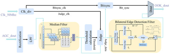 After that, the output signal “AGC_data” after gain control is demodulated; in order to prevent spike noise and burr interference in demodulation, we designed MF and BEDF for processing, respectively, and the optimized demodulation structure is shown in Figure 6. First, the input signal “Din” undergoes rectification and low-pass filtering. The spike noise within the envelope signal of the filtered output is removed through MF, with the filter window size selected as 9 based on simulation results. The process of implementing MF on an FPGA begins with the low-pass filtered output signal, which is first fed into a shift register that stores the most recent nine samples of data ( to ). These samples are then divided into three groups, each containing three samples. Within each group, the samples are sorted to determine the maximum, median, and minimum values. Next, the median value from each group is selected to form the final output “Dout”. This process effectively filters out outliers, such as spiky noise, thereby smoothing the signal and improving its quality. To ensure accurate signal reconstruction, an adaptive joint decision threshold is employed for signal judgment. This threshold is initially configured according to the channel conditions and dynamically adjusted in real time using a 255-bit shift register to compute the mean value. The calculated average is then weighted and integrated with the initial threshold, ensuring reliable evaluation even when the initial sample size is limited. The judged signal is subsequently processed by BEDF. The implementation of the BEDF involves the detection of jumps in the input signal “Judge_data”, which is performed by a jump detection unit to identify the rising and falling edges of the signal. For each detected transition (rising edge and falling edge ), the time interval between them is measured by count, and this time interval is compared with a preset threshold value to determine the validity of the signal change. If is less than , the signal change may be caused by noise; if is greater than or equal to , the signal change is considered valid. Based on this judgment, an output signal is controlled by a switching circuit to ensure that the signal is allowed to pass only when ≥ . This filters out burrs that do not satisfy the bit duration requirement and ensures the accuracy and reliability of the signal. Finally, the demodulated signal is output under the control of the “Bit_sync” clock generated by the Bitsync module.