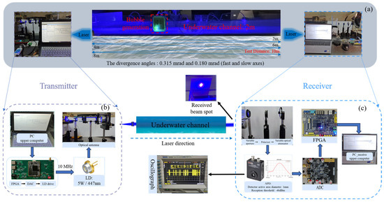 Components of the UWOC experimental platform. (a) System test platform, (b) transmitter composition, and (c) receiver composition.