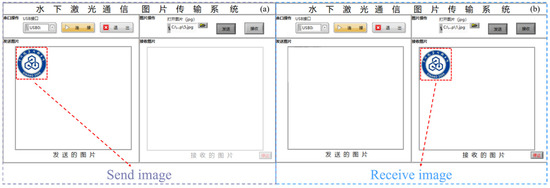 Upper computer display. (a) Picture of sending side, and (b) picture of receiving side.