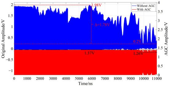 First, the fully digital AGC performance was tested; the output can be stabilized by adjusting the AGC gain coefficient by a certain amount, as shown in Figure 9. The blue curve depicts the original sampling signal, with fluctuations increasing in line with bubble strength. The red curve, on the other hand, represents the output signal after AGC module control. To avoid amplifying noise, the digital AGC gain is maintained within 0.2–2 V. Specifically, when the sampling signal Din is 0.2 V, the AGC gain adjusts to 1.26 V; when Din is 1.98 V, the AGC gain output stabilizes at 1.37 V. These results indicate that the AGC module can consistently maintain an output level of approximately 1.37 V, with a gain adjustment range spanning from −3.2 dB to 16 dB, thereby meeting the system’s gain control requirements.