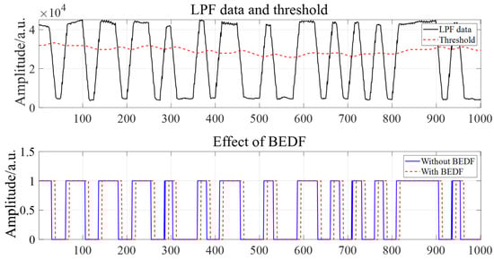 Subsequently, the MF performance in the demodulation structure was analyzed, and the results are presented in Figure 10. The X-axis represents the sampling time, while the Y-axis indicates the relative magnitude of the digital signal in arbitrary units (a.u.). The figure demonstrates the effect of median filtering on the envelope signal. The blue dashed line corresponds to the original envelope signal, which exhibits significant spike noise. In contrast, the red solid line represents the median-filtered signal, where the spike noise has been effectively suppressed, resulting in a smoother waveform. This filtering process enhances the reliability of subsequent threshold calculations, thereby improving the overall demodulation performance.