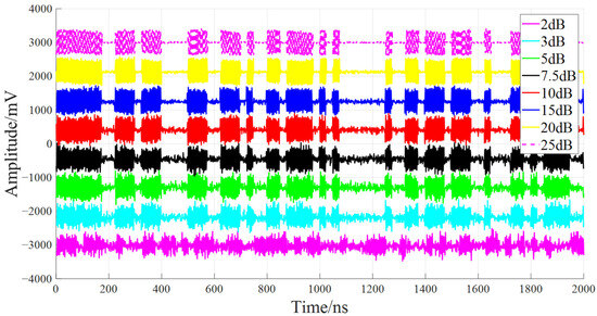 Firstly, the BER of the system was evaluated under various SNRs. Sampled signals at various SNRs are illustrated in Figure 12. As the SNR decreases, the received signal waveforms become increasingly distorted. Specifically, when the SNR is reduced from 25 dB to 3 dB, the waveform of the sampled signal progressively deteriorates, but the data stream remains consistent. When the SNR is further decreased to 2 dB, the sampled signal begins to distort, making it difficult to recover the original signal using signal processing techniques.