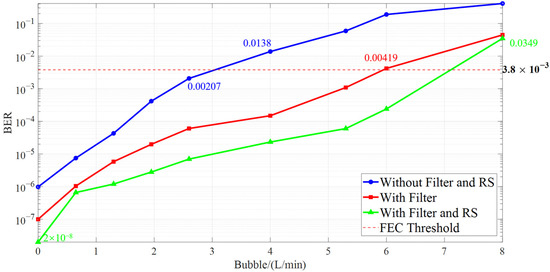 To further verify the effectiveness of improving system reliability through filtering and coding, the system’s ability to resist underwater turbulence was tested under an SNR of 25 dB. As shown in Figure 7a, a gas pump was used to generate bubbles of varying intensities to simulate underwater turbulence. The gas pump features three flow rate settings and four bubble channels, with a maximum flow rate of 8 L/min, allowing for precise control of bubble intensity. The bubble intensity is calculated from the current flow and number of channels. The experiments were carried out by simulating different turbulence conditions. The results are shown in Figure 14. The system’s BER is 2 × 10−8 at a bubble intensity of 0 L/min, which represents the actual performance of image transmission under pure seawater. As the bubble intensity increases, the BER of all systems rises approximately linearly. However, the use of filtering and RS coding significantly reduces the system’s BER under different bubble intensities. At a bubble intensity of 3 L/min, the original system’s BER approaches the FEC. As the bubble intensity increases to 6 L/min, communication becomes unreliable without filtering. Filtering enhances reliability by nearly a factor of two, bringing the system closer to the FEC threshold. With RS coding applied, the system maintains reliable transmission even at a bubble intensity of 7 L/min. When the bubble intensity further increases and the BER exceeds the error correction capability of RS coding, the system’s BER dramatically increases. These experiments demonstrate that MF and BEDF effectively enhance system reliability, particularly in complex environments.