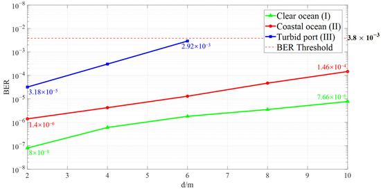 Finally, the corresponding experiments were analyzed under three different water quality conditions: clear seawater (I), coastal seawater (II), and turbid harbor water (III). Clear seawater, characterized by a high amount of dissolved particles, contrasts with coastal seawater, which has higher turbidity due to increased dissolved and suspended particles, and turbid harbor water, which exhibits the highest turbidity and severely limits light propagation due to strong absorption and scattering effects. The total link loss coefficients, attributed to underwater absorption and scattering, are 0.151 m−1, 0.339 m−1, and 2.195 m−1 for clear seawater, coastal seawater, and turbid harbor water, respectively [51]. To simulate coastal seawater, natural seawater was collected from the coastal area of Dushu Lake in Suzhou. The seawater was filtered to remove large particles while retaining its natural constituents. Fine sediment particles (such as clay and silt) and organic matter (such as algae and detritus) were then added to the filtered seawater to adjust the concentration and achieve the desired water quality level. The proportions of these additions were carefully controlled to ensure that the total attenuation coefficients, calculated using Equation (6), were 0.147 m−¹, 0.333 m−¹, and 2.114 m−¹, respectively, which approximately simulate the three water qualities. The communication was tested at distances ranging from 2 m to 10 m under three simulated water qualities, and the results are illustrated in Figure 16. With the increase in transmission distance, the system’s BER increases approximately linearly. When the transmission distance reaches 8 m in class III water quality, it is difficult for the receiver to detect the laser signal and the communication link is broken. The results show that when the received light intensity is within the detectable range of the APD, the BER of the system is lower than the FEC in the three types of water quality, which satisfies the demand for reliable communication in a wide range of underwater environments.