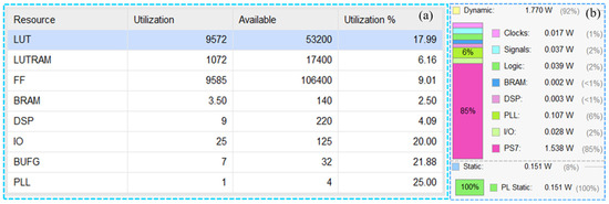 The system power consumption is illustrated in Figure 17b, which comprises two primary components: dynamic and static energy consumption. The dynamic energy consumption dominates, accounting for 92% of the total, while the static energy consumption constitutes the remaining 8%. Within the dynamic energy consumption, the PS module is the largest contributor, consuming 85% of the total power. This is primarily due to data interactions between the host computer and the PS side, as well as extensive storage tasks on the DDR. The overall power consumption of the system is maintained at a low level of 1.921 W. To further reduce system power consumption, dynamic voltage and frequency scaling (DVFS) technology can be used on the PS side to dynamically adjust the operating voltage and frequency according to the load conditions, thus significantly reducing power consumption during low-activity periods, while gated clocks can be used on the PL side to apply gated clocks on the programmable logic (PL) side to deactivate unused logic modules during idle states, thus further reducing power consumption.