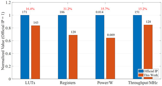 Further comparative analysis between the optimized RS coding module and the official IP reveals significant improvements in resource efficiency (LUTs and registers) and low power consumption, while maintaining competitive throughput, as illustrated by the metrics listed in Figure 18. By converting Galois field multiplication into bitwise XOR operations, particularly during the encoding process, the hardware complexity is effectively reduced. Specifically, the proposed design achieves a 16.4% reduction in LUT usage, a 31.2% reduction in register usage, and a 35.7% reduction in power consumption, with only a 15.2% decrease in throughput, from 151 MHz to 128 MHz. However, considering the actual communication rate of the system, this design not only meets the requirements but also provides considerable redundancy margin.