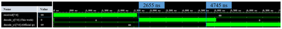 The receiver state machine effectively reduces decoding delay, particularly for error-free data, thereby significantly minimizing decoding time and enhancing decoding efficiency. As shown in Figure 19, at 100 MHz clock frequency, the design outputs the decoding result “decode_y” at 2655 ns, which is 2090 ns earlier than the 4745 ns timing required by the official IP for its “decode_y1” output. This improvement is equivalent to a reduction of 209 clock cycles and results in a substantial decrease in overall decoding time.
