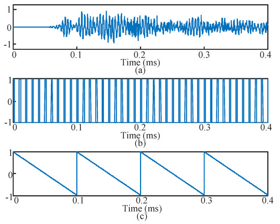 The signals used in the algorithm validations include the following two types: Case 1, separation of rail cracks under simulated noise interference, and Case 2, Separation of rail cracks under real additive railway noise. The simulation validation (Case 1) was used to make sure the feasibility of the proposed method in a standard separation task with a specific known source number. The experimental validation (Case 2) was used to verify the applicability of the proposed method in an actual railway environment. The proposed method is first compared with different BSS methods in a three-source and four-channel simulation. In the simulated experiment, the actual burst-type rail crack signal is adopted as the investigated signal. These actual crack signals were previously acquired in tensile tests of a rail specimen [29]. A detailed description of the tensile test system has been given previously and will not be repeated here. To match the actual crack signal, the sampling rates of the source signals are all 5 MHz with a length of 0.4 ms. The ramp waves and square pulses represent the periodic and impulse interference signals, which normally exist in a typical railway analysis. The frequency of the ramp wave is 10 kHz, while the frequency of square pulse is 100 kHz with a 20 percent duty cycle. The original sources are shown in Figure 4.
