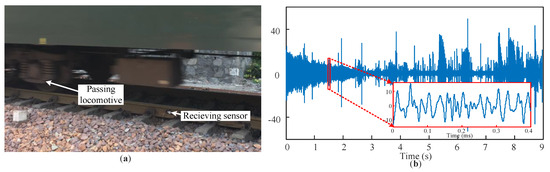 In order to investigate the proposed method in real operating conditions, AE wheel–rail noise signals were acquired from an actual rail line in Jiaozuo, Henan province [30]. The rail tracks were made up of 60 kg/m rails and the material U75V. The tracks were examined to ensure they were intact in advance. As is shown in Figure 6a, the experiment is carried out when a passenger train is passing. The speed of the passenger locomotive is about 55 km/h. The sensor was fixed on the rail waist by the mechanical clamp, and couplant was used to fill between the sensor and rail surface for better signal transmissibility.
