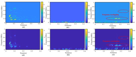 STFDs for (a1,a2) a typical rail crack AE signal from the tensile dataset; (b1,b2) an exemplified section of stationary railway background noise; and (c1,c2) an exemplified section of non-stationary railway abnormal noise. Note that subfigures in the first rows and second rows were obtained from SPWVD and CWD, respectively.