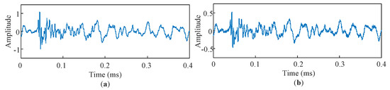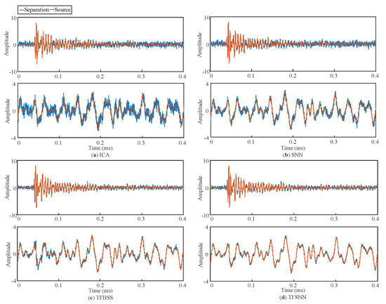 To further validate the practicability of the proposed method for the defect separation, on-site experimental noise is used to represent complicated noise properties and synthetize the two-channel observation signals. Gaussian noises at −20 dB were also added to the observations for the noise resistance investigation. The entire separated signals and a zoomed-in figure of the detailed sections within [0, 0.05] milliseconds are shown in Figure 10 and Figure 11, respectively.