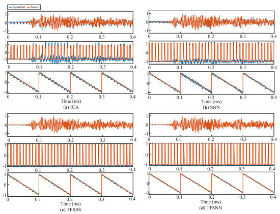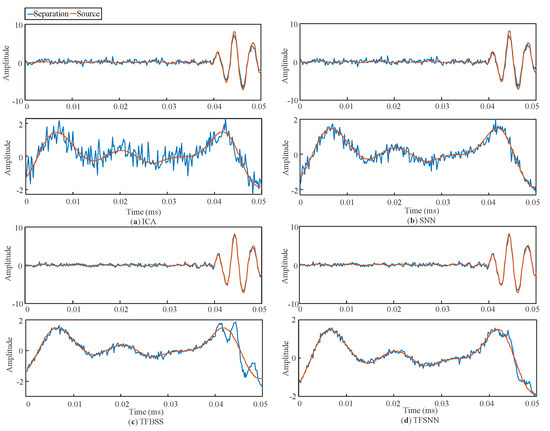In conclusion, as shown in Figure 12 and Table 3, the performance of different BSS methods is mainly influenced by their stability. For an easy and stationary separation case, the four algorithms might provide a basically identical separation performance. In challenging separation scenarios like non-stationary noise, the absence of time–frequency (TF) analysis can cause traditional algorithms to experience significant degradation, resulting in a decreased average separation performance. Theoretically, time domain BSS methods such as ICA assume statistical independence in either the time or frequency domain. However, this assumption may not hold for non-stationary signals, where the frequency content varies with time, and it makes the methods sensitive to the signals [34]. Particularly, in a noisy environment characterized by time-varying frequency content, the adaptive tracking capabilities of time domain BSS might become unstable, potentially leading to degraded separation performance due to violation of the fundamental assumption. This result is substantiated in Figure 12. Then, averaged performance of the whole test sets was determined by the proportion of degraded samples. A lower instability for ICA and SNN made for a higher possibility of degradation, while time–frequency BSS is particularly useful in this case, taking full advantage of the time–frequency information.