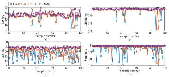 On the basis of systematic assessment with the whole test sets in Case 2, the SISNRs for a group of 100 randomly selected test signals are first displayed in Figure 12a,b. The similarity coefficients for the same test group are displayed in Figure 12c,d. In addition, the averaged values and standard deviations of the group SISNRs and group similarity are listed in Table 3.