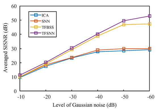The overall and averaged SISNRs for the crack and noise signals are shown in Figure 12a,b. In terms of SISNR, the four algorithms show significant differences in noise suppression effects. All the compared methods can provide roughly satisfactory separation results, with 15 dB for defect signals. While for railway noise signal separation, the ICA and SNN algorithms were significantly weaker (about 5 dB lower) than the TFA-based algorithms, and the separated signals were still interfered with by the residual abnormal noises. Moreover, the dynamic robustness of the compared methods against different Gaussian noise levels was evaluated, as shown in Figure 13. As the noise amplitude decreased from −10 dB to −60 dB, the compared methods gradually converged and reached their maximal SISNRs, where TFSNN obtained an approximately 20 dB higher SISNR than the time domain methods and 5 dB higher than TFBSS. This indicated the separation accuracy or convergence limits of the time–frequency methods were much higher than the time domain methods. When the noise amplitude increased to −10 dB, all the compared methods degraded significantly. However, the proposed method degraded at a much lower speed and remained about 2 dB higher than the compared methods in this case. This indicated a better robustness of the proposed method under random noise interferences.