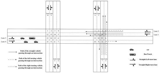 As shown in Figure 1, to probe the traffic flow characteristics of a moving bottleneck, we created a virtual road network, which consists of an arterial road and several access roads, with intersections formed where the arterial road and access roads meet. Both the arterial road and access roads are bidirectional four-lane roads, and the intersections are controlled using a fixed signal cycle. We also assumed that there are only two types of vehicles in the road network: small cars and heavy-duty trucks. Furthermore, apart from intersections, there are no other fixed traffic bottlenecks, such as entrance and exit ramps in the road network.
