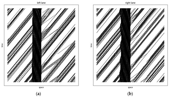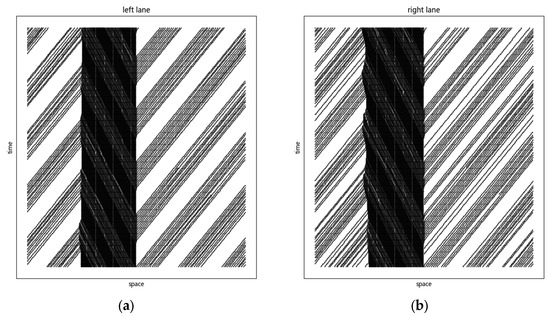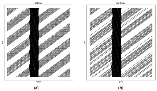 Figure 6. (a,b) Spatial-temporal operation diagram when the proportion of heavy-duty vehicles is 0.3.