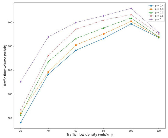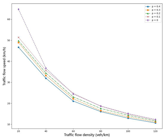 From Figure 8, it can be observed that the average vehicle speed is maximized when only small cars are present in the traffic flow, while it is minimized when the proportion of heavy-duty trucks is 0.4. As the input traffic density increases, the average speed of the road network’s traffic flow gradually decreases, but the rate of decline gradually flattens out. When the traffic flow density (k) of the road network is less than 80 vehicles per kilometer (veh/km), the proportion of heavy-duty vehicles has a significant impact on the average speed of the traffic flow. With a constant traffic flow density, the average speed decreases as the proportion of heavy-duty trucks increases. However, when the traffic flow density (k) exceeds 80 vehicles per kilometer (veh/km), the influence of the proportion of heavy-duty vehicles on the average speed becomes less pronounced. These results indicate that when the traffic density is low, the introduction of heavy-duty vehicles restricts the speed of following vehicles in the same lane, forcing them to decelerate, follow at a distance, or change lanes to maintain a safe distance between vehicles. At this point, the moving bottleneck effect is evident. However, as the traffic density increases and road traffic approaches saturation, the impact of heavy-duty vehicles on traffic flow diminishes, and the moving bottleneck effect weakens.