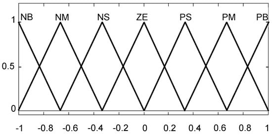 In the fuzzy PID design, fuzzy sets with the same properties for all variables were designed. For the type of fuzzy sets, the triangular membership function (MF) (trimf), whose graphs are given in Figure 2, was selected. The following linguistic labels were used for their names: “Negative Big” (NB), “Negative Medium” (NM), “Negative Small” (NS), “Zero” (ZE), “Positive Small” (PS), “Positive Medium” (PM), and “Positive Big” (PB).