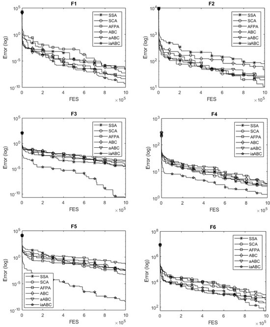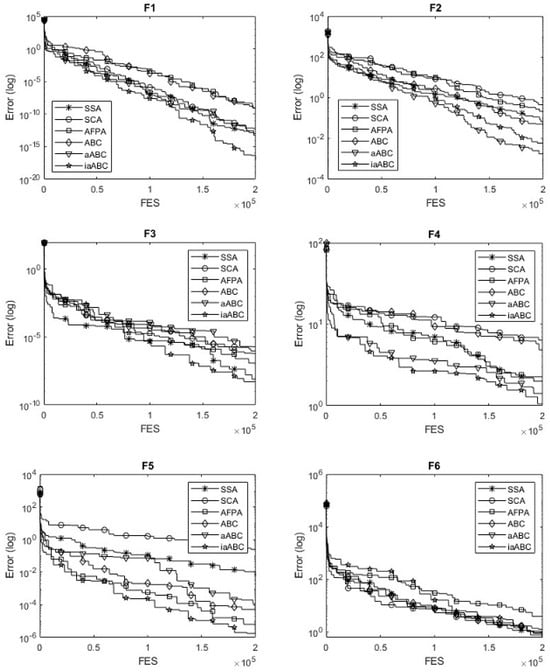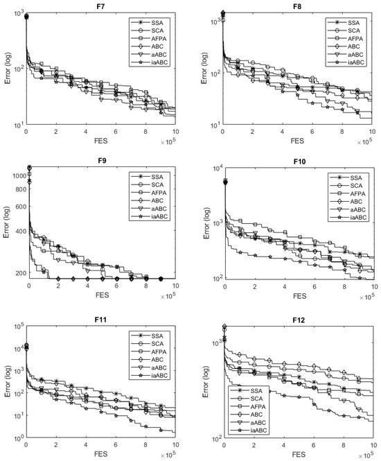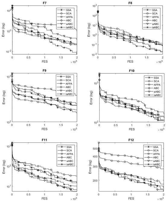 However, iaABC produces solutions with the most successful mean and SD values for F2 and reaches a convergence accuracy of 1E-3. However, it also produces the optimal result for the F3 and F5 functions. Regarding the compared hybrid functions, iaABC produced the optimal result for the F7 function and achieved 1E-1 convergence accuracy for the F8 function. Composition functions are formed by combining various complex functions, each of which may have multiple local optima. This complexity presents a challenge for the optimization capabilities of metaheuristic algorithms. The proposed method successfully identifies the optimal result for the F11 function, which is one of the composition functions. However, it does not achieve optimal results for the F9, F10, or F12 functions. However, when looking at each function from the perspective of 30 trials, the convergence accuracy of iaABC reached 1E+2. When these results are evaluated, it can be said that iaABC has a certain ability for global exploration.