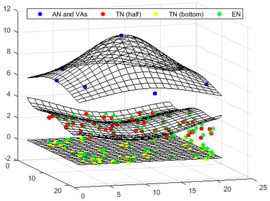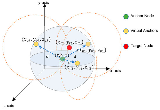 In a 3D environment, as illustrated in Figure 6, four anchors are needed to position the TNs: one anchor to identify the center point and three virtual anchors (VAs). Using the information from the calculated center point, the iaABC method is then applied for optimal positioning.