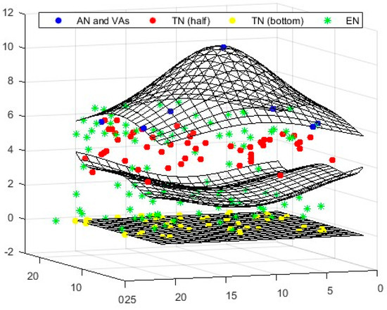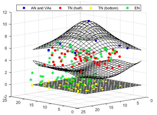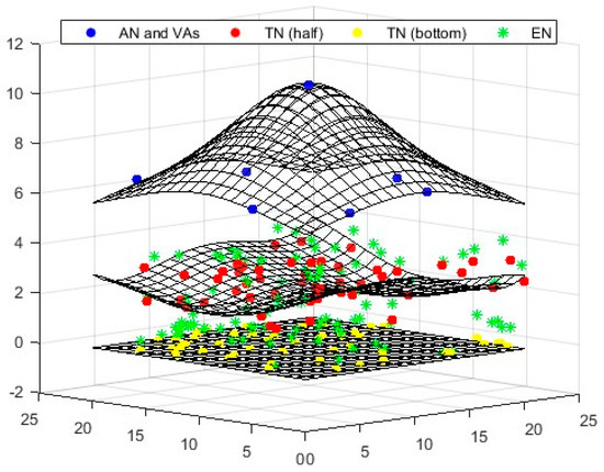To determine the locations of target nodes (TNs), a single anchor node (AN) positioned at the top can be utilized. This method organizes all nodes in three distinct layers: a single AN in the top layer, and 50 randomly distributed TNs in the middle and bottom layers (total 100). Virtual anchors (VAs) are situated in the upper layer, while the TNs are randomly positioned in the lower layers. The beacon signal generated by the AN plays a crucial role in the random placement of the TNs. When a TN falls within the AN’s range, it obtains the Received Signal Strength Indicator (RSSI) information from the anchor, which allows it to calculate the distance between the AN and the TN using the Euclidean formula. In this study, the degree of irregularity (DOI) value was set to 0.01.