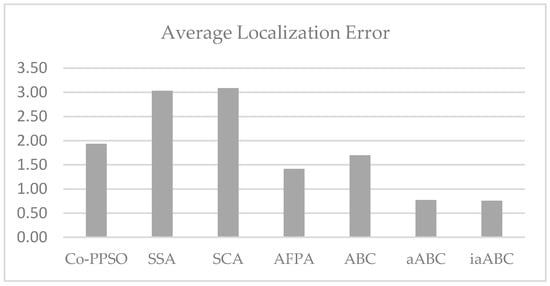 This section discusses the localization performance of iaABC for WSNs in a 3D environment. In this context, the proposed method is compared with the competitive algorithms used in the previous subsection. The localization results of the competitive algorithms are shown in figures, and the errors in localization and processing times are presented in tables.