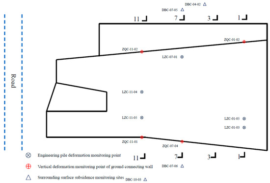 In deep foundation pit engineering, part of the internal structure of the foundation pit will be implemented before the earthwork excavation, such as engineering piles [1] and underground continuous walls [2]. The unloading effect produced during earthwork excavation presents a “space-time effect” with the progress of the construction time sequence [3]. On the one hand, with the different construction processes, the amount of earthwork affects the soil properties in and around the foundation pit as well as the deformation of the pile foundation and the internal envelope structure inside the foundation pit [4,5], thus showing a “time effect”. On the other hand, due to the deformation of the internal structure of the foundation pit caused by earthwork excavation, the surrounding strata move, resulting in different degrees of settlement of the ground surface around the foundation pit as well as deformation and damage of existing facilities in the vicinity [6]. In an urban center area with high building density, the relationship between the position of foundation pit and adjacent structures is complicated and diverse. At the same time, due to different design schemes, the spatial distribution of the internal structure of the foundation pit is also relatively complicated, thus showing significant spatial effects [7]. Therefore, most scholars pay more attention to the “space-time effect” caused by foundation pit construction on the deformation of foundation pit structure and the surrounding surface settlement. Zheng Gang [8] proposed a whole-process control method for the corresponding possible deformation mode of a foundation pit by summarizing the deformation characteristics at each stage of excavation under different hydrogeological conditions and foundation pit scales and their impact on the surrounding environment. Wang Dengqun et al. [9] combined the site monitoring data of a foundation pit project and concluded that the composite support structure of an underground continuous wall is suitable for deep water cut foundation pit projects. Marco Valerio Nicotera et al. [10] obtained the influence of construction sequence on the above monitored values by monitoring the displacement of supporting structure and the settlement of surrounding buildings in the shaft and platform tunnel in a complex construction environment in loose strata and tuff strata during the whole construction process. Mohamed Nabil Houhou et al. [4] established a finite element model for excavation calculations for deep foundation pits and compared the calculated results with the actual monitoring values to further analyze the impact of foundation pit excavation on adjacent structures. Yanru Zhao et al. [11] proposed an automatic monitoring system through real-time monitoring of structural responses in tunnels and foundation pits and used it to automatically control the tunnel construction sequence. This method can help better control the surrounding environment and structural deformation. Yue Dong et al. [12] proposed Adjusted-Logistic time function model, which can predict the deformation of supporting piles under different geological engineering conditions. Qi Zhang et al. [13] proposed an improved clustering method based on GMM and combined it with long- and short-term memory neural networks to analyze and predict the deformation caused by the next construction step. Based on a large number of monitoring data, Hanzhi Liu et al. [14] concluded that structural deformation is closely related to the change of land surface settlement over time, showing strong spatial coordination, and established a deformation control evaluation method for large deep circular foundation pits in soft soil foundations. Based on empirical mode decomposition and recurrent neural networks, Zaobao Liu et al. [15] developed a method for predicting lateral deformation analysis of support structures. Xiaojing Zhou et al. [16] proposed a hybrid deep learning model based on the graph gated network of causality, which can embed time series into the model to improve the accuracy of the predicted value of the monitoring points of the internal structure of the foundation pit. Zhang Dongmei et al. [17] and Zhang Wengang et al. [18] studied the influence of different construction conditions, soil mass, and structural strength on the internal structural deformation of a foundation pit through numerical simulation and established a deformation prediction model based on this. Zhang Xiang et al. [19] pointed out that pile length and pile diameter have a significant influence on the resilience deformation of foundation pits within a certain range. Leng Wuming et al. [20] found that engineering piles can effectively restrain foundation pit deformation, but there is an obvious marginal effect. By establishing a numerical model, Li Haitao et al. [21] pointed out that pile-anchor supports have an obvious anti-settlement effect, and reducing the application angle of the anchor cable can effectively offset the ground settlement of foundation pit and the lateral displacement of enclosure structures caused by spatial effect.