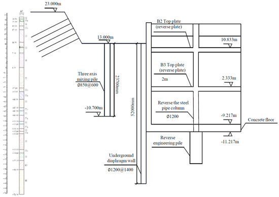 The project is located in the urban area of Beijing. The plane dimension of the foundation pit is 350 m long, the width 120–190 m, and the depth of the foundation pit is 32.6–36.9 m. The excavation scale is far beyond an ordinary foundation pit. The construction scheme of the foundation pit is mainly divided into two kinds: the construction of the range of elevation from 0 m to 20.5 m is adopted in the straight way, and the construction of the range of elevation from 0 m to the bottom of the foundation pit is adopted in the reverse way. On the north side of the foundation pit, the two underground layers are supported by reverse soil compression and side span inversion, and the three underground layers are supported by full inversion. On the south side of the foundation pit, a three-axis cement mixing pile water stop wall is added outside the 30 m area of the foundation pit, and the interior adopts the ground connecting wall, the underground three-layer reverse work, and the anchor cable enclosure system. On the north side of the foundation pit, the plan of the first underground layer is adopted, the slope is 8 m, and the engineering piles, ground connecting walls, and bored piles are installed on the platform. The rest of the enclosure is in the form of an underground continuous wall, two layers of reverse slab, and two concrete supports. The internal structure of foundation pit, including the underground diaphragm wall, engineering pile, reverse pile, steel pipe column, slope protection pile, etc., are all operated at the absolute elevation of 13.0 m. The 3-3 profile of the foundation pit is shown in Figure 1. The thickness of the underground continuous wall inside the foundation pit is between 0.8 m and 1.2 m, and the depth is about 52 m, of which the stressed section is 45 m, and the section below 7 m is the extended section. In addition, distributed fixed-point optical cable is used to monitor soil settlement.