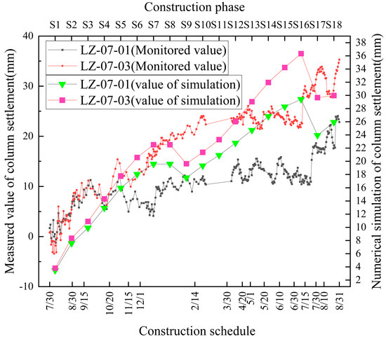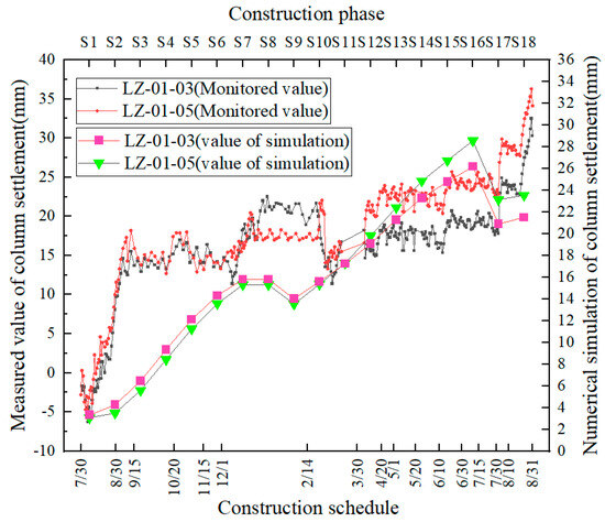 The omnidirectional displacement meter is used to monitor the structural deformation inside the foundation pit and the surrounding surface settlement. The actual deformation monitoring values and numerical simulation values of columns and ground walls at different positions in the foundation pit during construction are shown in Figure 4, Figure 5 and Figure 6. It can be seen that the numerical simulation results and monitoring data have a high agreement, indicating that the established finite element simulation model can better reflect the deformation characteristics of the structure in the ultra-large deep foundation pit.
