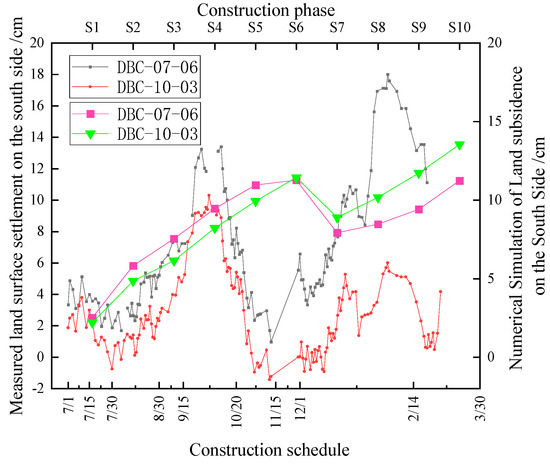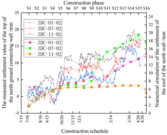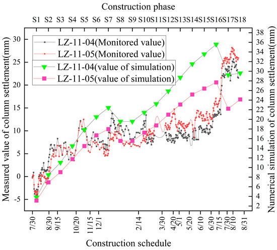 In Figure 11 and Figure 12, the deformation monitoring values and numerical simulation values of the surface settlement and displacement monitoring points at different profile positions of the foundation pit during the whole construction process are given, in which the positive is the settlement and the negative is the uplift. As can be seen from the figure, the deformation monitoring values and numerical simulation values of the north and south surfaces both show several shape deformation characteristics, indicating that the established finite element simulation model can better reflect the deformation characteristics of the structure in the super-deep foundation pit. With the excavation and the construction of the foundation pit, the settlement deformation value increases first, then decreases and then increases, and the settlement rate increases when the settlement deformation decreases. On the one hand, due to the reduction of earthwork excavation rate, sand has the “lag” of stress transfer [29,30], and the surrounding soil has sufficient time to release the stress. In addition, due to the application of each floor, the flexural deformation of foundation pit envelope can reduce the settlement deformation of surface soil.
