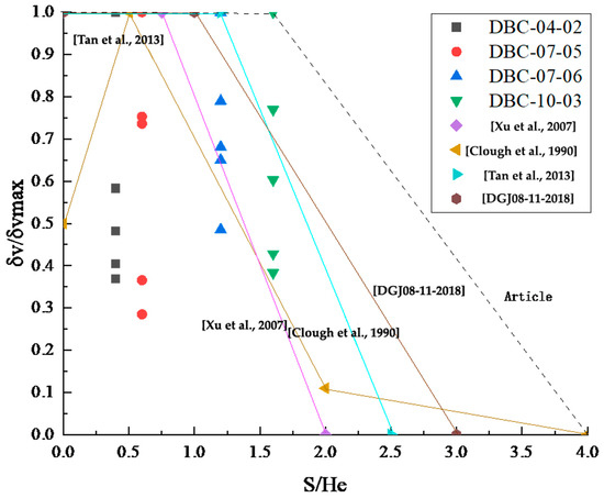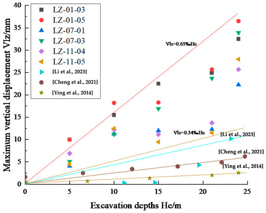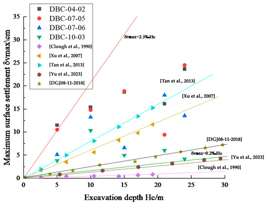 To better show the deformation law of surrounding surface settlement with excavation construction, Figure 13 shows the maximum δvmax of surface settlement at each excavation depth and its relationship. Compared with relevant research results, it can be seen that the surface settlement caused by the excavation of this super-large deep foundation pit ranges from 0.2% to 2.3% He. The upper limit is much larger than Clough [31] and Tan [32] Tan Statistical range of surface subsidence in hard clay strata and Xu Zhonghua [27]. The statistical surface settlement range is similar to the deep underground foundation pit engineering in the soft soil area of Shanghai, but the lower limit meets the distribution of foundation pit specifications [33] The recommended surface settlement control value when the environment level is 1, where the upper limit of surface settlement is located on the north side of the foundation pit, and the lower limit is located on the south side of the foundation pit [29].