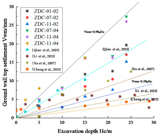 The relationship between the settlement of the roof of the ground wall and the depth of excavation [7,24,27,28].