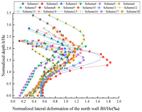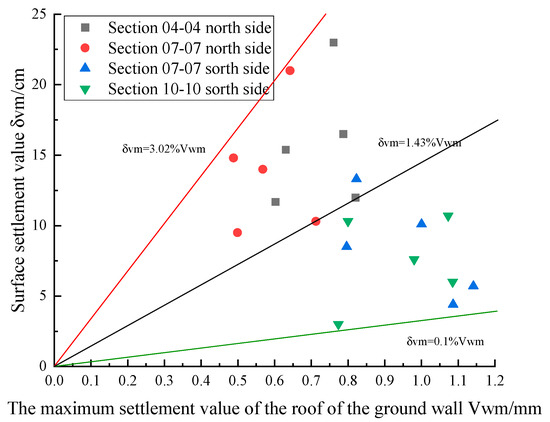 Figure 15 shows the relationship between the maximum surface settlement and the wall top settlement. The maximum surface settlement δvmax on the north side lies between 1.43% and 3.02V%wm, and the maximum surface settlement δvmax on the south side lies between 0.1% and 1.43%Vwm.
