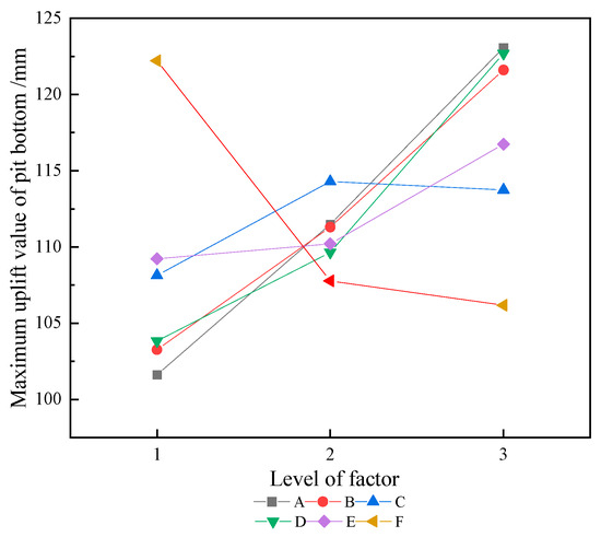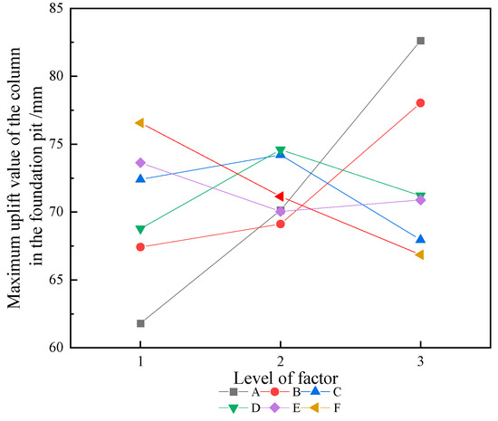 From the observation of Figure 16 and Figure 17, it can be seen that the order of factors affecting the uplift deformation of the column inside the foundation pit is depth > groundwater level > column diameter > length-to-width ratio > column spacing > column length. At the same time, the excavation depth of the foundation pit is positively correlated with the uplift deformation of the column, while the other five factors are all negatively correlated, and the impact of reducing the groundwater level is the most obvious. The decrease of the groundwater level reduces the side friction resistance between pile and soil, and reduces the ability of the column to resist the uplift deformation caused by the unloading rebound of soil. With the increase of pile diameter ratio, the area replacement rate between pile and soil increases, and the stress ratio of pile and soil decreases, which is more conducive to the coordinated displacement and deformation of pile and soil and can control the uplift and deformation of the column [35]. At the same time, the application of the vertical plate, the reverse plate, and the bottom plate can enhance the integrity of the inner enclosure structure of the foundation pit and can use the self-weight of the structure to restrain the uplift and deformation of the column (Figure 18).