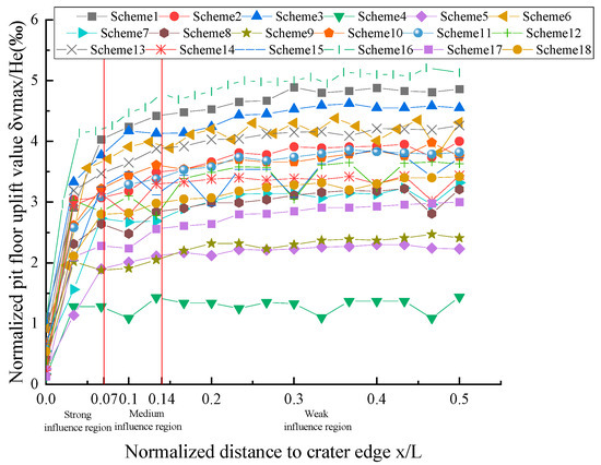 From the observation of Figure 16 and Figure 19, it can be seen that the order of influencing factors of soil uplift deformation at the bottom of the pit is depth of foundation pit > column spacing > groundwater level > column diameter > column length > length-to-width ratio. The relationship between column diameter and soil uplift deformation at the bottom of the pit is negatively correlated, while the other five influencing factors are all positively correlated. With the decrease of column spacing and the increase of column diameter, the interaction between pile and soil is enhanced, and the stiffness of pile and soil is increased, which can reduce the rebound of soil at the bottom of pit caused by soil excavation and unloading. In addition, through timely precipitation treatment, on the one hand, the saturation in the soil body can be reduced to improve the shear strength of the sand and enhance the stiffness of the bottom soil. On the other hand, the seepage and consolidation of the soil in the impervious layer can reduce the uplift and deformation of the soil at the bottom of the pit. At the same time, the soil heave at the bottom of the pit has a “corner effect”. The deformation of the soil heave at the corner of the ground wall is more serious, and the change of soil heave at the bottom of the pit is not obvious with the gradual distance from the ground wall. According to Figure 20, the areas of strong, medium, and weak influence of bottom uplift after foundation pit excavation are (0~0.07) × L, (0.07~0.14) × L, and (0.14~0.5) × L, respectively.