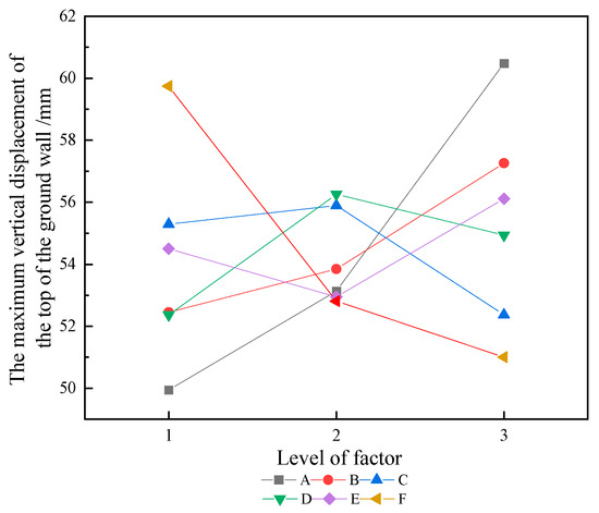 According to Figure 16 and Figure 21, it can be seen that the influencing factors of foundation pit wall settlement deformation are in the order of foundation pit depth > column diameter > groundwater level > column spacing > length-to-width ratio > column length. The excavation depth of the foundation pit is positively correlated with the settlement deformation of the foundation pit wall, while the other five influencing factors are all negatively correlated. The main reason for the settlement and deformation of the ground joint wall is that the earth pressure behind the wall is acted on by excavation and unloading, which causes the ground joint wall to bend and the sliding body in the foundation of the ground joint wall, thus driving the whole deformation of the wall.