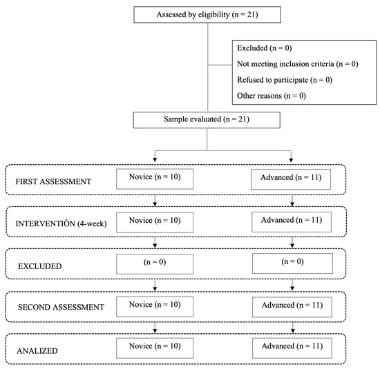 This study employed a quasi-experimental design with pre- and post-intervention assessments, adopting a single-blinded approach for evaluators and utilizing two parallel groups. The methodology adhered to the Transparent Reporting of Evaluations with Nonrandomized Designs (TREND) guidelines [19]. The intervention lasted four weeks, with a total of 12 sessions conducted 3 times per week (Monday, Wednesday, and Friday), each session lasting 75 min. Participants were stratified into 2 groups based on their CrossFit experience: (i) Novice group (n = 10; 3 males, 7 females; mean age = 22.30 ± 0.81 years), comprising individuals with 6–11 months of CrossFit experience; and (ii) Advanced group (n = 11; 7 males, 4 females; mean age = 22.80 ± 1.41 years), comprising individuals with ≥12 months of CrossFit experience.