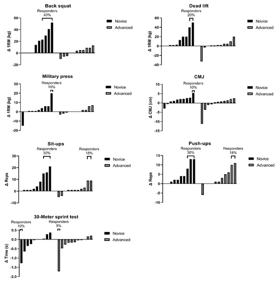 Table 4 provides a detailed comparison of performance changes for the novice and advanced groups. It focuses on the mean differences between pre- and post-test scores, along with the percentage of participants who responded positively to the training (responders) and the effect size (Eta squared, η2) for each variable. The analysis of inter-individual variability of body weight, BMI, fat mass, and fat-free mass, showing Rs only in the advanced group, where there was an Rs for BMI (n = 1; 9%; 0.03), fat mass (n = 1; 9%; 0.19), and fat-free mass (n = 1; 9%; 0.22). The novice group did not present any individual response in the morphological variables. The novice group presented Rs in back squat (n = 4; 40%; 0.51), deadlift (n = 2; 20%; 0.44), military press (n = 1; 10%; 0.09), CMJ (n = 1; 10%; 0.34), sit-ups (n = 3; 30%; 0.47), push-ups (n = 3; 30%; 0.50), and 30 m sprint speed (n = 1; 10%; 0.22). Concerning the advanced group, they only presented Rs in sit-ups (n = 2; 18%: 0.13), push-ups (n = 2; 18%; 0.27), and 30 m sprint speed tests (n = 1; 9%; 0.09). Figure 2 presented the inter-individual variability of physical fitness; the novice group presented Rs in back squat (n = 4; 40%), deadlift (n = 2; 20%), military press (n = 1; 10%), CMJ (n = 1; 10%), sit-ups (n = 3; 30%), push-ups (n = 3; 30%), and 30 m sprint speed (n = 1; 10%). For the advanced group, they only presented Rs in sit-ups (n = 2; 18%), push-ups (n = 2; 18%), and 30 m sprint speed tests (n = 1; 9%).