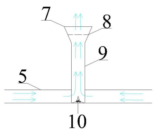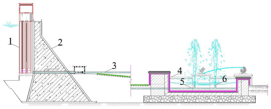 Figure 2 are shown the (1) intake tower, (2) dam, (3) dissipation pipeline, (4) dissipation tank, (5) distributor, (6) vertical jet energy dissipation component, (7) conical diffusion port, (8) crushing needles, (9) vertical jet pipeline, and (10) streamlined boundary layer.