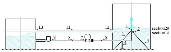 Figure 3). During the test, the control valve and the electromagnetic flowmeter are used to adjust and read the flow rate. The water is pumped from the intake tank to the pipeline through the centrifugal pump. The intake tank is equipped with a wave fence to stabilize the water flow on the right side of the tank. The water is pumped out of the vertical pipeline; then the jet tongue falls into the dissipation tank, and finally, the water flows through the open channel to the intake tank, forming a complete circulation test system. The horizontal plane 70 mm from the nozzle in the vertical pipeline is selected as the section