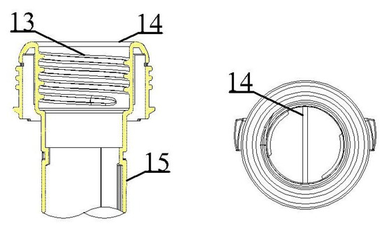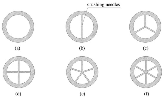 Figure 4. The crushing needles are installed at the nozzle of the vertical jet pipeline, and the screw port is integrated. The screw port is filled with threads, which is convenient for disassembly. The number and arrangement of the crushing needles is set in 6 working conditions, and the crushing needles are arranged at the same central angle, as shown in