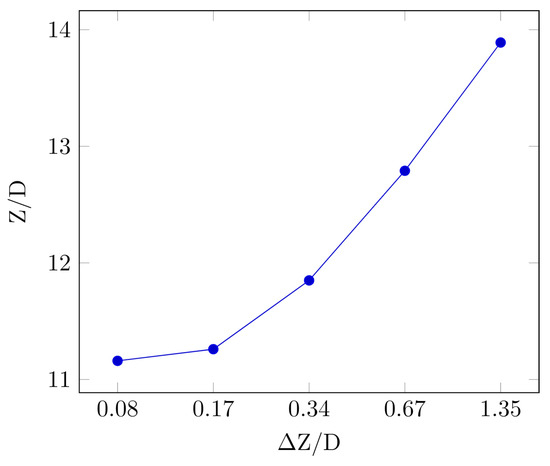 To verify the correctness of the selected mesh size, a mesh independence test was conducted. Polyhedral structured meshes with ΔZ/D values of 0.08, 0.17, 0.34, 0.67, and 1.35 were used to analyze the energy dissipation pool.