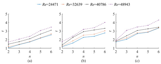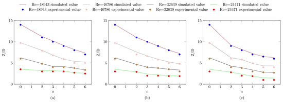Figure 8 shows a comparison between the simulated value and the experimental value of the dimensionless jet height of the vertical jet energy dissipator. It can be seen from the figure that both the simulated value and the experimental value decrease with the increase in Reynolds number. With increasing numbers and sizes of the crushing needles, the jet height also gradually decreases. The simulated value of the jet height corresponding to each test condition is close to the experimental value. The range of the correlation coefficient