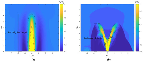 to show the outer boundary of the shear layer in the instantaneous flow field under the conditions of Re = 32,639, the size of the crushing needles m = 0.15, and the number n = 0. In this study, the height of the jet is defined as the distance between the jet from the outlet to the highest point of the outer boundary of the shear layer. Under dimensionless conditions, the spatial scale of the jet is dimensionless by the ratio of the distance in the Z direction, the distance in the X direction, to the diameter D of the nozzle. The whole model is divided by a structured grid, the grid size of the model is 0.17 D, and the crushing needle area is locally encrypted. The minimum grid size of the crushing needles’ area is 0.005 D, and the maximum grid size is 0.01 D. In the numerical simulation, the velocity input is used below the vertical jet pipeline, and the atmospheric pressure is set above the vertical jet pipeline. The outlet boundary is the pressure outlet; the wall is a non-slip wall.