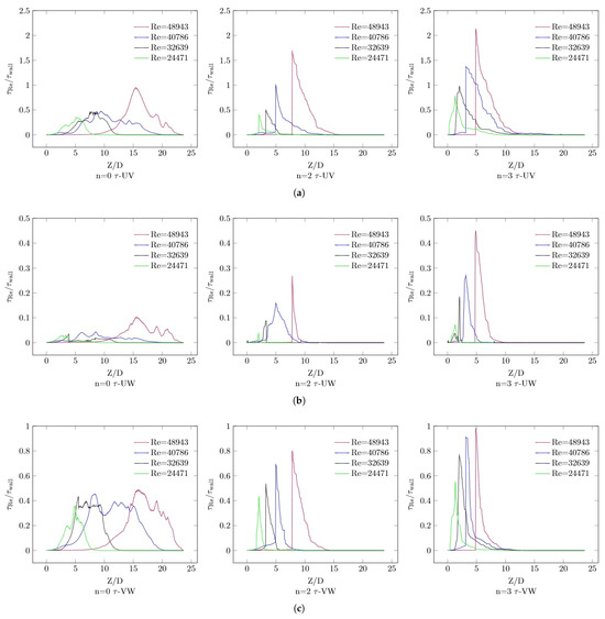 of the nozzle center point as the characteristic velocity and the diameter D of the vertical jet pipeline as the characteristic length are between 24,000 and 49,000, so the jet belongs to the fully developed turbulent state. The injection Reynolds number of the test is set to 4 working conditions, 24,471, 32,639, 40,786, and 48,943. Then, to nondimensionalize Reynolds stress, the boundary shear stress was also calculated as