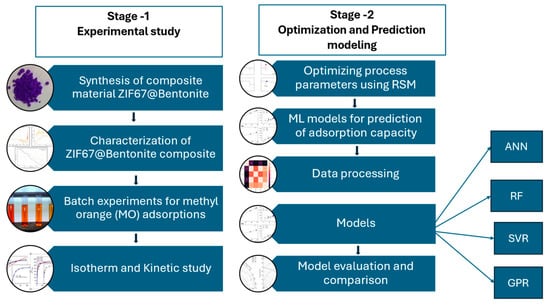A general framework for evaluating MO adsorption using ZIF-67@BNT adsorbent along with the ML modeling.