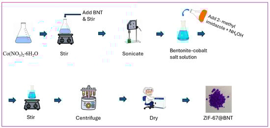 A schematic illustration depicting the preparation procedure of the ZIF-67@Bentonite (ZIF-67@BNT) nanocomposite.