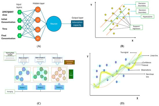 (A) ANN algorithm structure, (B) linear hyperplane-based SVR classification, (C) Random Forest algorithm architecture, and (D) Regressor for the Gaussian process.