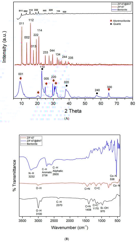 The X-ray diffraction (XRD) patterns of the ZIF-67@BNT nanocomposite, ZIF-67, and BNT are shown in Figure 5A. The diffraction pattern of BNT (shown in blue) shows some characteristic peaks related to the clay mineral structure. Major reflections seen at 2θ: 6.1° (001), 19.8° (110), 26.7° (020), 35.0° (220), 54.9° (240), and 68.1° (330) correspond to different planes of crystals existing in BNT [41] The basal reflection determined close to 6.1° (001) is an indicator of the montmorillonite interlayer spacing, which is a fundamental structural property of BNT. Some peaks established near 20–30° correspond to quartz impurities predominating in natural BNT, while their broad character signifies an amorphous phase of BNT owing to its hydrated layered silicate structure. The calculated crystallite size of BNT is 2810.19 nm; therefore, it shows structural features in relatively large particle dimensions and a less defined crystalline nature than ZIF-67.